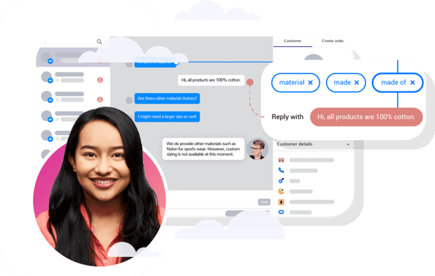 Guidez les clients vers vos produits, concrétisez vos ventes et boostez votre chiffre d'affaires grâce à des fonctionnalités basées sur l'IA et dédiées à la vente conversationnelle.